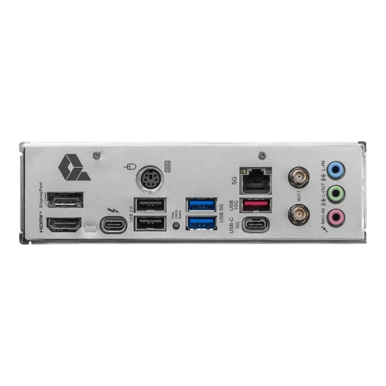 Rear I/O Ports 1 x Thunderbolt™ 4 (Type-C, 40Gbps with 8K display support), 1 x HDMI™ 2.1, 1 x DisplayPort 1.4, multiple USB Type-A and Type-C ports, 5G LAN port, Wi-Fi/Bluetooth antenna connectors, audio connectors, and a Clear CMOS button.
